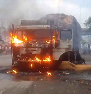 बरेली मोड़ पर डीजल टैंक फटने से मक्के से लदे ट्रक में लगी भीषण आग, ट्रक में आग लगने से मचा हड़कंप