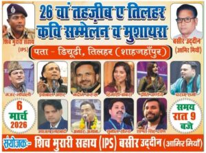 टेन न्यूज़ !! ०१ मार्च २०२६ !! अमुक सक्सेना, तिलहर/शाहजहांपुर । नगर में होली के पावन अवसर पर एक बार फिर कौमी एकता की अनूठी मिसाल देखने को मिलेगी। तिलहर के मोहल्ला हिंदू पट्टी निवासी श्री शिव मुरारी सहाय (आईपीएस) की ड्योढ़ी पर वर्षों से चली आ रही परंपरा के तहत इस वर्ष भी 6 मार्च को भव्य कवि सम्मेलन एवं मुशायरे का आयोजन किया जायेगा ।