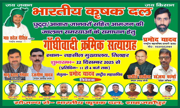 तिलहर तहसील प्रशासन की कथित उदासीनता और जनसमस्याओं की लगातार अनदेखी के विरोध में 22 दिसंबर से भारतीय कृषक दल का गांधीवादी क्रमिक सत्याग्रह